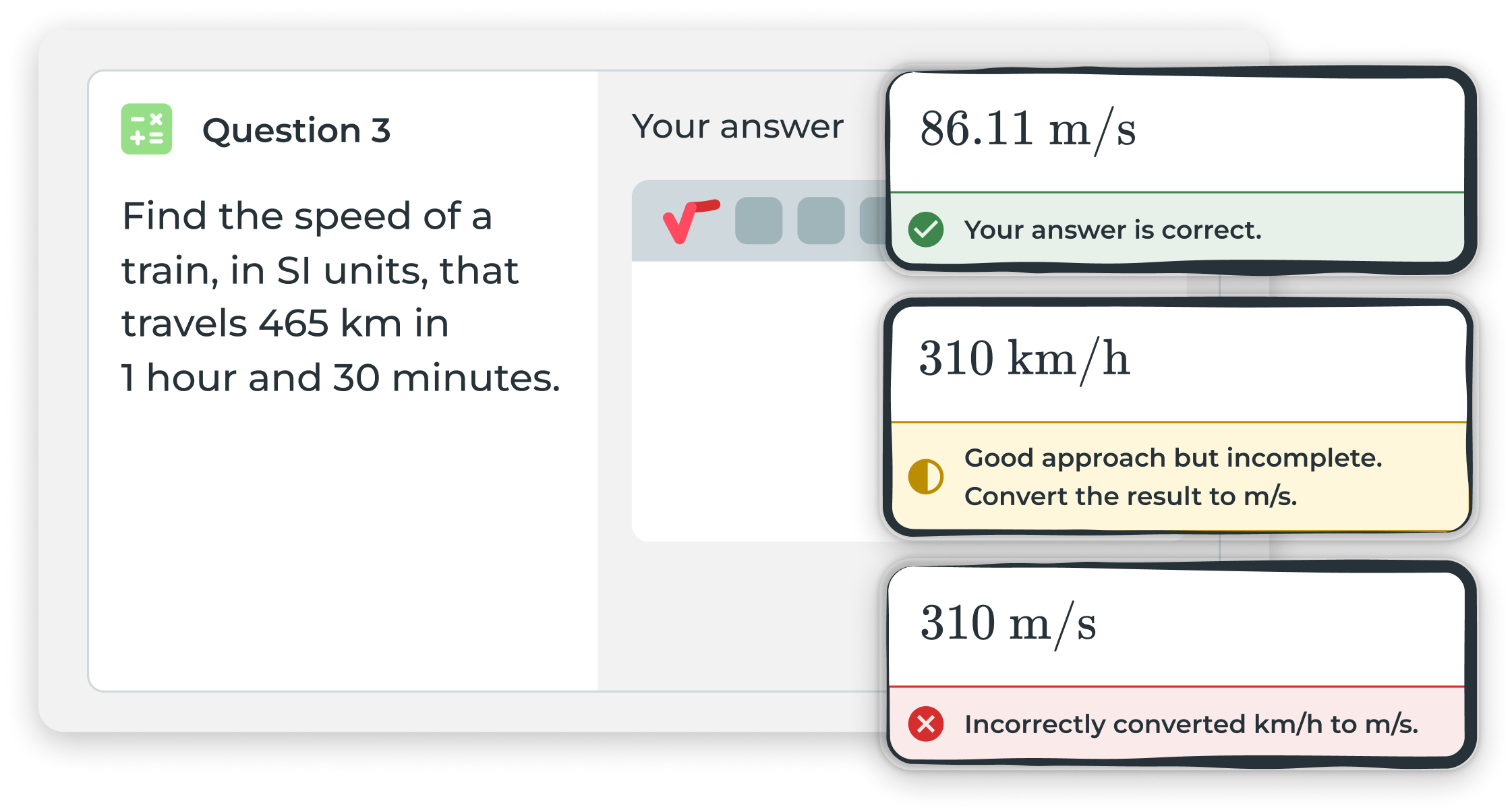Validate student answers for math equivalence, correct syntax, numerical tolerances, and proper unit handling. You can script custom grading functions for the answers to meet specific conditions.